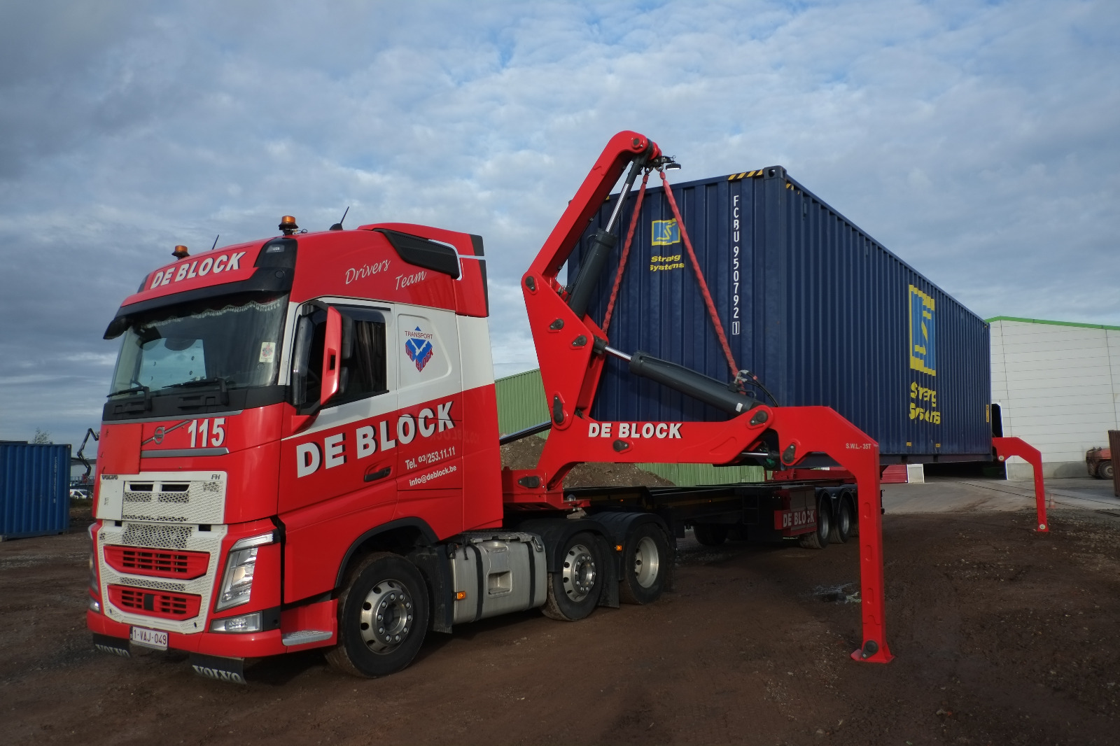 The sideloader is a specialized system that can lift and place containers horizontally next to the vehicle, allowing containers to be set down or picked up directly from ground level—no crane or additional lifting equipment needed.